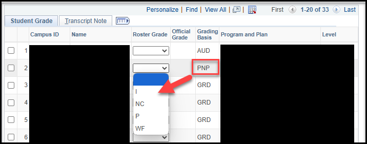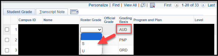 - Note that not all students are registered under the same grading basis. Most students/classes will have the standard GRD grading basis options (A, AB, B, etc.). Other students/classes may be enrolled with the P/NP (pass/no pass: I, NC, P, or WF) or AUD (audit: S or U) bases. For more information on the P/NP and Audit grading bases, see the grading policy and audit enrollment pages in the Catalog.