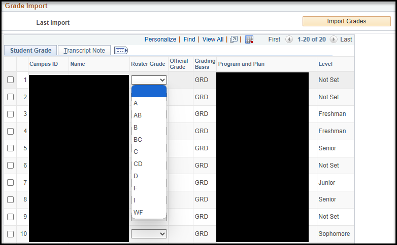 The roster lists students alphabetically by last name of their preferred name. Grades are entered for each student using the drop-down menu in the Roster Grade column. Clicking on the drop-down menu will open a list of the available grade choices for each student.