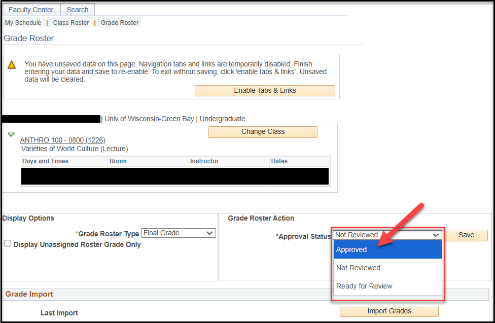 - After you have completely finished entered grades and have saved, scroll to the top of the page to the "Grade Roster Action" section. As shown below, use the drop-down arrow next to Approval Status, select Approved and then click the Save button next to the drop down menu box. ALL students must have a valid grade entered before the status can be changed.