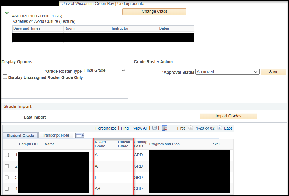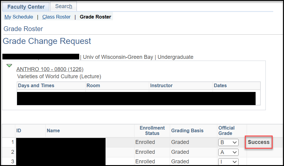 - If you click Return to Grade Roster on the bottom of the page, you will see that the grade has officially changed. The old grade will appear in the Roster Grade column.