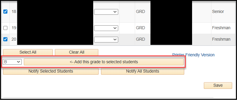 To assign a grade en masse, begin by clicking either Select All at the bottom of the roster or checking the boxes on the left side next to the students you'd like to assign the same grade. Then, use the grades drop-down menu underneath the roster to select the specific grade to assign and click <- Add this grade to selected students next to it. If you utilize this option, you still retain the ability to edit individual grades (ex. 15 students earned an 'A', 2 earned a 'B'), this does not "lock" any grades for the students.