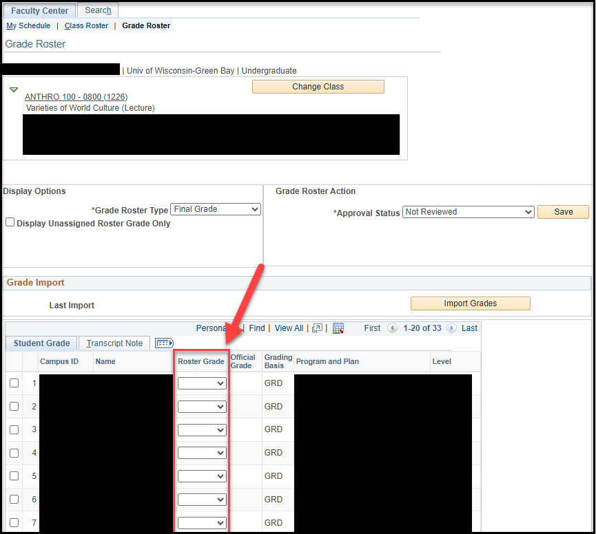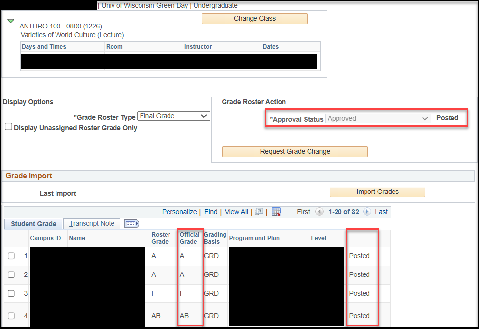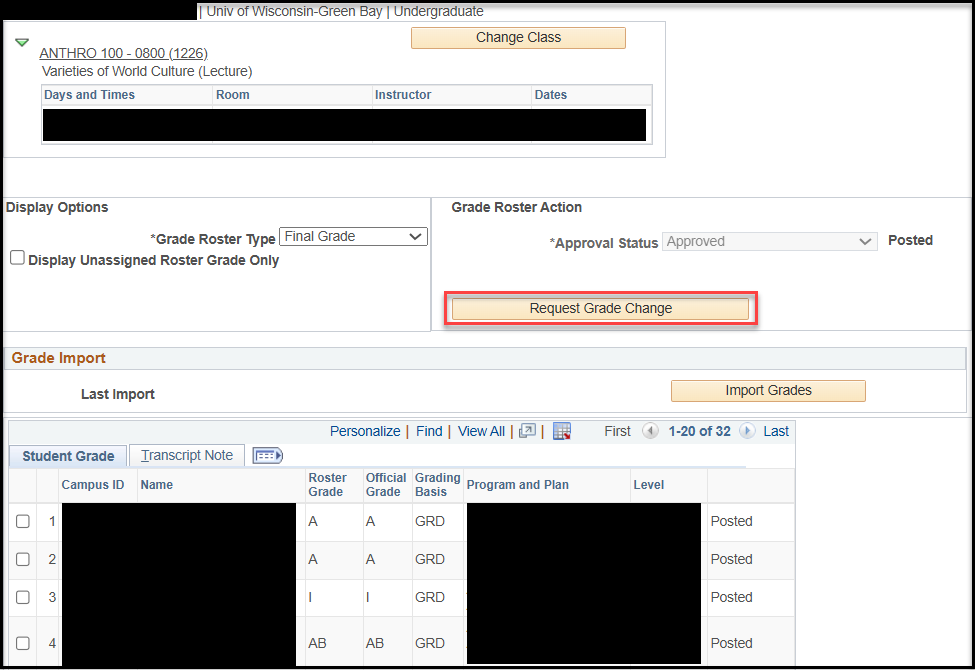 If you need to change a grade after your grade roster has already been posted, click Request Grade Change in the Grade Roster Action section: