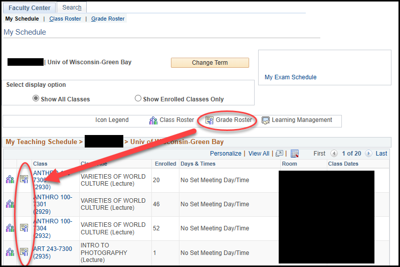 If there is no grade roster icon next to a course, a grade roster has not been created. If you believe this to be an error, please contact the Registrar's Office for assistance at registrar@uwgb.edu.