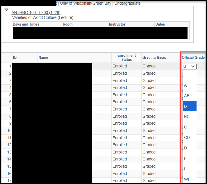 Using the drop-down menus in the Official Grade column, select the new grade and click Submit at the bottom of the page.