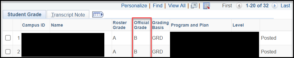 Students will not be able to see their grades until the grade posting process has been run by the Registrar's Office. This process runs automatically twice a day, once in the morning and once in the afternoon. There are several indicators that will tell you if your grades have been posted: 1) the Approval Status becomes grayed out and "Posted" appears next to it; 2) the Official Grade column will be populated; 3) "Posted" will appear next to each student's row.