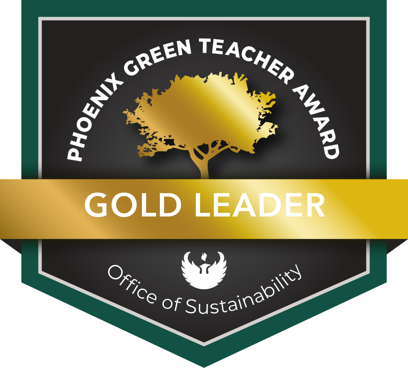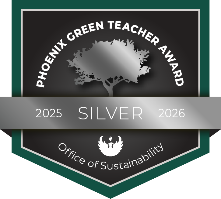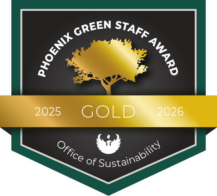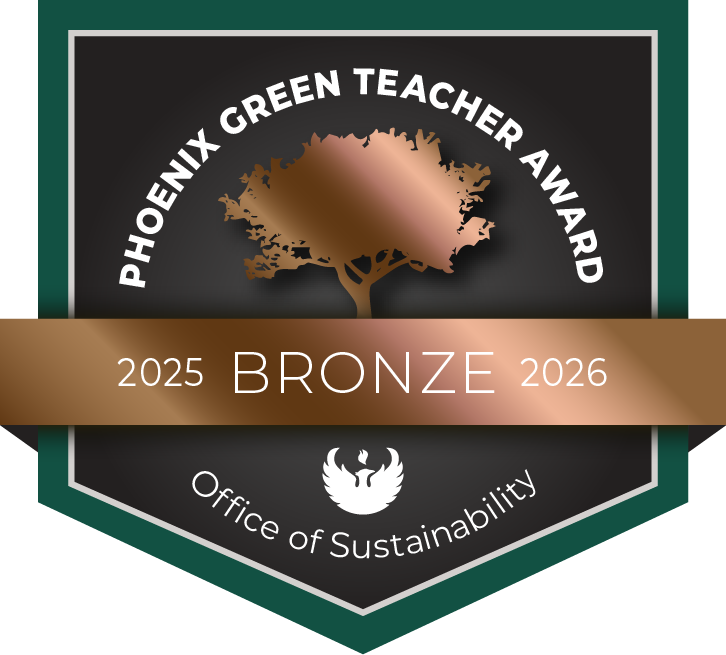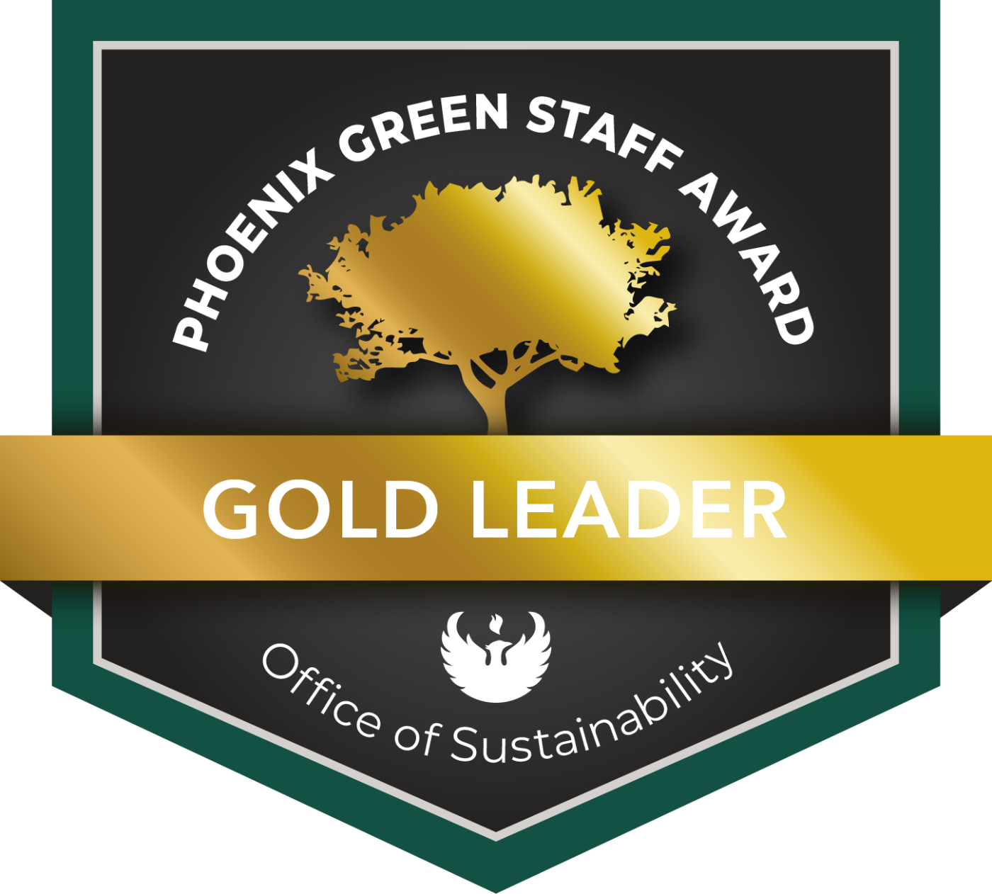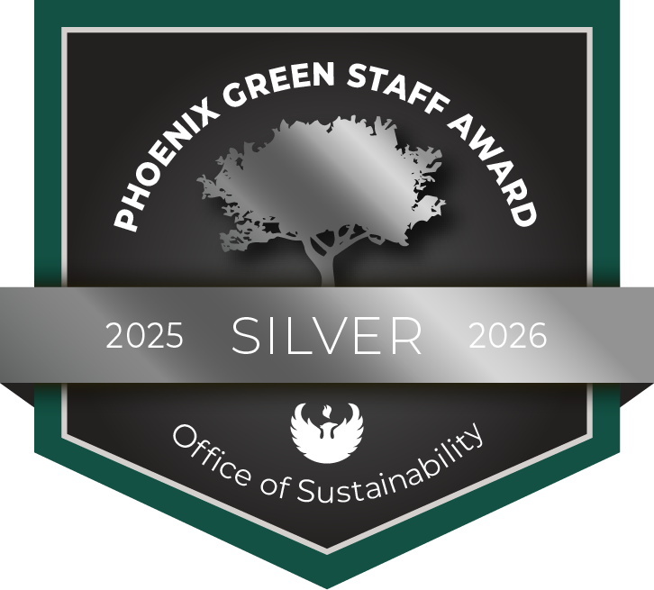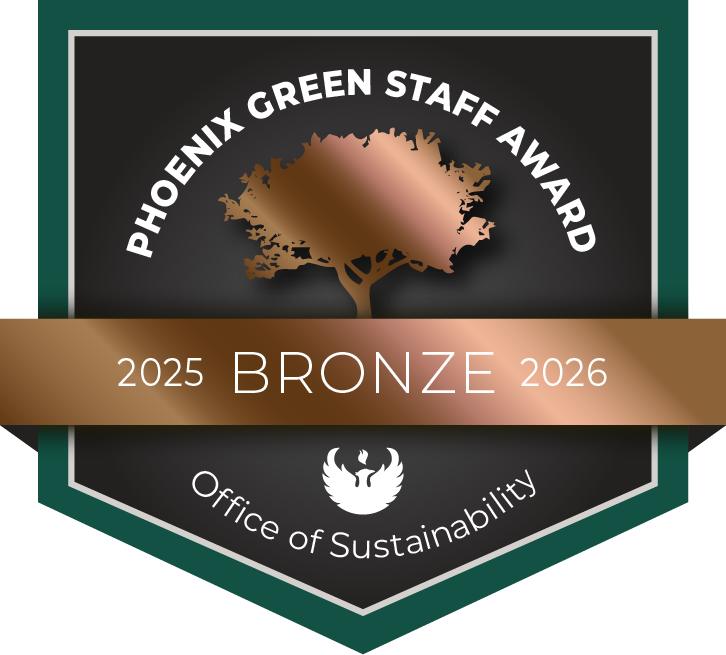 The Phoenix Green Teacher Award Program recognizes our instructors who promote environmental sustainability through their teaching and seek to minimize negative environmental impacts associated with teaching. Likewise, the Phoenix Green Staff Award recognizes our staff members who promote environmental sustainability through their daily actions and seek to minimize negative environmental impacts associated with their support roles. Award recipients will receive a dated digital award that they can display on syllabi, Canvas, webpages, etc. Awards expire on August 31 of each year. To apply, complete this survey to document your green teaching and operational behaviors in several areas.