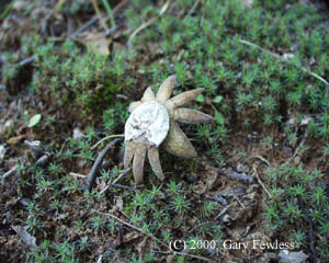 | Earth star mushrooms look roughly similar to the familiar "puffballs" when young. As they mature the outer covering splits along several lines and the segments curl back resulting in the characteristic shape. The points of the star can curl up or down thereafter in response to humidity. As seen in this picture, earth star mushrooms usually grow on sandy soils with very low productivity. A good place to look for them in our area is in open forests of northern pin oak (Quercus ellipsoidalis) and jack pine (Pinus banksiana). | |||||||||||||||||||||
