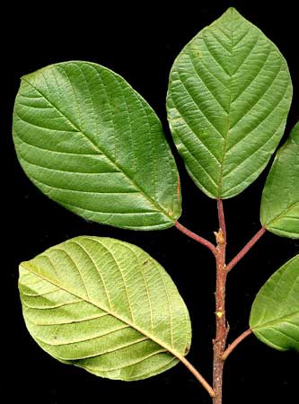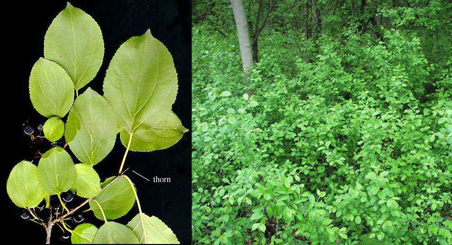 European Buckthorn is one of the most troublesome invasive plant species in Wisconsin. As illustrated in the righthand portion of the photo, it forms dense stands within existing native forests and displaces nearly all native plant species with its dense growth. It produces numerous black cherry-like fruits which are eagerly eaten by birds that carry the seeds widely to infest other forests. Although it can invade nearly any forest, the establishment and spread of European Buckthorn is dramatically enhanced by opening the canopy and disturbing the soil as is done in the construction of trails and roads through the forest. European Buckthorn can be recognized by the thorns at the ends of the branches (see photo) and by the abundant black fruits and the dark green leaves that persist until mid to late November, often remaining conspicuous when other trees are bare. There is also a closely related species called "Glossy Buckthorn" (Rhamnus frangula) which is equally invasive, but prefers wetter soils. It differs in having no teeth along the leaf margins and in having shiny leaf surfaces, but produces similar dense stands within our forests as well as in a variety of more open sites. |