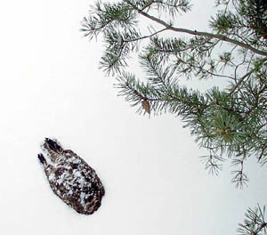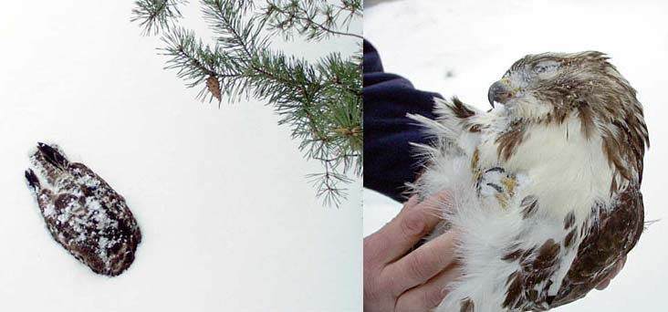 | In last week's photo a young Red-tailed Hawk took unusual risks to feed on an Eastern Cottontail close to buildings and people. The young hawk pictured here was not so lucky. It was found dead in the snow with no wounds or obvious damage and weighing much less than normal. It is likely this unfortunate bird died from starvation. Prolonged low midwinter temperatures require hawks to increase their calorie intake to survive, while the cold weather and deep snow make prey harder to locate and catch. As the young hawk lost weight it probably also became less able to catch prey. | |||||||||||||||||||||