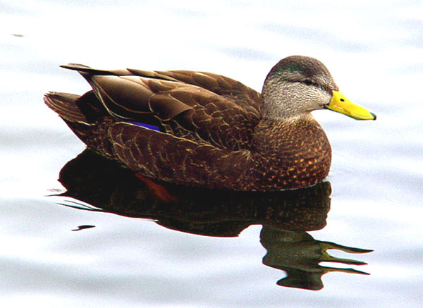 The American Black Duck is native to eastern North America, where it breeds in lakes, ponds, streams, and coastal marshes of predominantly forested landscapes. It was once considered the "bread-and-butter" duck of waterfowl hunters in the northeastern U.S. and Canada, where it typically accounted for 40% to 60% of the annual harvest. By the 1940's, however, populations began to decline, reaching all-time lows in the early 1980's. Today, numbers have stabilized somewhat, but the species is still considered a priority concern by the North American Waterfowl Management Plan. Factors responsible for the decline of Black Ducks include loss and degradation of habitat, overhunting, and interactions with the closely-related Mallard (Anas platyrhynchos), which has expanded its range into eastern North America from the Great Plains. Adult Black Ducks feed on seeds and tubers of aquatic plants, in addition to animals foods like snails and mussels along the coast. Ducklings feed exclusively on mosquito larvae and other aquatic invertebrates during their first two weeks, making them vulnerable to environmental contamination by toxic chemicals. Hybridization with the genetically dominant Mallard is believed to be a significant threat to populations of American Black Ducks. Since 1940, nearly 1.7 million Mallards have been released in game farms within the range of the Black Duck, and native Mallard populations have moved eastward into the open landscapes created by forest clearing. Winter feeding at places like the Bay Beach Wildlife Sanctuary brings both species in contact during the spring courtship period. The Black Duck shown in this picture appears to contain some Mallard ancestry, as evidenced by the greenish feathers in the head region. If interbreeding with Mallards continues over many years, it is conceivable that the American Black Duck might by "hybridized into extinction" much in the same way that the Red Wolf has been affected by expanding Coyote populations in the southeastern U.S.