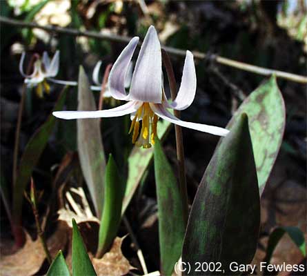 Yellow Trout Lily (Erythronium americanum) is also known as Adder's Tongue, Dog-tooth Violet, Fawn Lily. The mottled leaves resemble spots of a fawn or a trout, as reflected in some of the common names. The name "Dog-tooth Violet" is unfortunate, because this species is not even closely related to the Violets. Yellow Trout Lily is a member of the group of plants known as spring ephemerals. They grow in deciduous forests and share a general style of life history in which they must grow early in the spring to get sufficient sunlight before the tree canopy develops leaves and severely reduces the light levels for the summer. Many spring ephemeral species then go dormant during the summer. A similar species, White Trout Lily (Erythronium albidum) also grows in our area. The leaves of the two species are indistinguishable. Both species are clonal, forming large populations under good conditions. Young plants or those more heavily shaded may develop only one leaf and will not flower in that year. More robust plants (ramets) capable of flowering will develop two leaves. Yellow Trout Lily is distributed across much of the eastern United States. In Wisconsin it is most abundant in the area of Brown, southern Oconto, Manitowoc, Kewaunee and Door counties and in the Stevens Point/Wausau area.