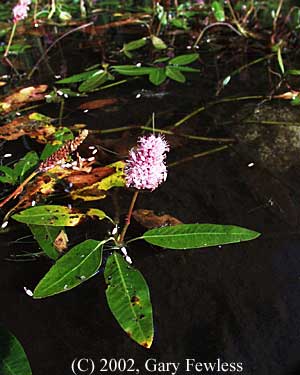 Weevils have the distinction of being the most diverse family (Curculionidae) in the most diverse Order (Coleoptera, beetles) in the most diverse Class (Insecta) in the most diverse Phylum (Arthropoda) in the Kingdom Animalia. In other words, the 48,000 species of weevils make it the most species-rich family of insects and possibly the most diverse group of organisms on Earth. Weevils are most diverse in the tropics and become less diverse in colder climates. North America is home to over 2400 species. Because there are so many species of weevils they are likely to be found in most ecosystems including wetlands. All North American species of weevils feed on plants. Several species in the genus Lixus specialize on plants in the Buckwheat (Polygonaceae) family. For example Lixus concavus feeds on dock and also on rhubarb. Females of Lixus rubellus bore into the stems of wetland plants in the Buckwheat family (Polygonaceae) to lay their eggs. The larvae feed on the plant tissue until the metamorphose into adults. The adults also feed on plants. Adults of Lixus rubellus have been collected from on water smartweed (Polygonum amphibian) (Pierce 1907), like the one shown above. Water smartweed is truly "amphibious", as the Latin name Polygonum amphibium implies. It can grow as an erect plant on the land as in the plant shown above, or it can grow as an aquatic variety in which the leaves float on the surface of the water. The flowers and fruits are similar in either case. The fruits of smartweeds are an important wildlife food. Contributed by Vicki Medland and Gary Fewless, Cofrin Center for Biodiversity |