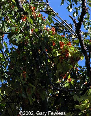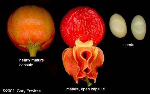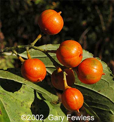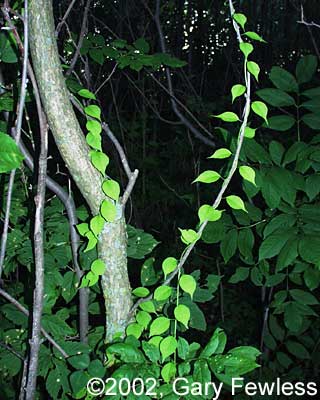 The fruits of American Bittersweet are the most striking character of this species, being comprised of a bright orange capsule which splits open at maturity (late September or early October in northeastern Wisconsin) to expose the bright pink inner structure shown above. The pink structure is comprised of several fleshy "arils", each of which contains a seed. The seeds (up to 8 per fruit, but often fewer) are reported to be poisonous. This is a species that does not go unnoticed, but the fruits may be high enough to frustrate the attempts of observers to see them up close. As they near maturity they appear to be bright orange berries, but as the capsules split open and the pieces curl back they appear much different and might well be mistaken as two different species by the casual observer. Bittersweet is dioecious: plants are either male or female, and only the female plants bear fruit. American bittersweet is a native vine that can grow in a wide variety of habitats, but is most common in fencerows, along roadsides and other open sites. It sometimes grows in forests where it often climbs into the canopy to get enough light. Stems can grow to an inch in diameter and sometimes the plants can assume the growth form of a weak shrub, the two forms occasionally found together. It is found throughout the state, although it appears to be more common in the sourthern portions.