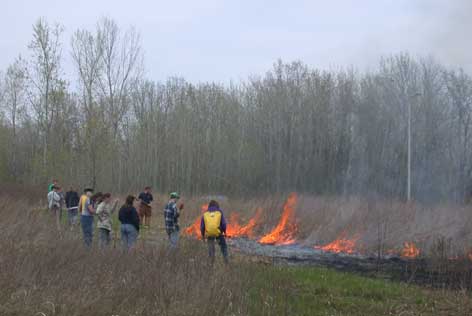 The Cofrin Arboretum surrounding campus includes an area that can be referred to as “restored” or “created” prairie. The area is abandoned agricultural land that was replanted in the mid-1970s. Since the late 1970s the lands of the Keith White Prairie on the north end of campus have been subject to annual fire management to reduce woody species in favor of grasses and discourage invasion of exotic species. The site(s) chosen for burning differ each year depending on soil moisture and temperature and on vegetation moisture level. The entire prairie is never burned in any given year, but small sections are burned on 2 to 5 year cycle. Date of burning also varies yearly from mid-April to mid-May depending on weather conditions. Ideal conditions are moderately dry with little wind. The burn must take place before the perrenial prairie grasses and forbes have begun to grow, but after the annual weedy grasses have sprouted to be effective. Strips of land or firebreaks are cleared of vegetation to prevent the fire from spreading too rapidly. The fire is simply started with matches and fire-fighters from the City of Green Bay helped to move the fire along the prairie. Students with backpack watersprayers and rakes prevented the fire moving into adjoining fields and forest. This year Amanda Malueg, an undergraduate biology