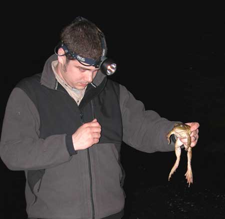 UW Green Bay graduate students Julie Gibson, Brad Herrick, David Marks, and Steve Price presented the results of their masters thesis research at the Society for Conservation Biology Meeting being held in Duluth, MN this week. Each week in July we will feature the research of these students who have worked for and done research at the Cofrin Center for Biodiversity. Their research has been supported by a donations by the Cofrin family and helps us preserve the biodiversity of birds, wetlands, and amphibians in the Northern Great Lakes region. This week we feature the research of Steve Price who received his undergraduate degree in Environmental Science at UW Green Bay and and is now completing a masters degree in Environmental Science and Policy with an emphasis in Ecosystem Studies this summer. He has worked on a number of research projects involving amphibians including the EPA GLEI project with his advisor Dr. Robert Howe. His research on four- toed salamanders (Hemidactylium scutatum) has resulted in publications in Herpetological Review. Price's research quantified the effects of habitat composition and scale on the distribution of anuran species in 63 coastal wetlands of the western Great Lakes region. Amphibians have been widely employed as indicators of habitat quality, however the local distribution of amphibians is greatly influenced by habitat factors. Amphibian habitat can be measured at different scales of space and time creating fundamental challenges for identifying critical habitat factors. However, although the coastal Great Lakes coastal environment is an important habitat for amphibians, few studies have focused on amphibian-habitat relationships in coastal areas. Anuran-calling surveys and habitat variables were collected at both local and landscape scales during 2002 and 2003. Stepwise logistic regression was used to create models for spring peepers (Pseudacris crucifer), eastern gray treefrogs (Hyla versicolor) and green frogs (Rana clamitans ) at each scale. Results from the logistic regression and a statistical comparison of the models (McFaddens’s R2) emphasize that habitat predictors for anurans depend on scale and differ between species. Green frogs, gray treefrogs and spring peepers are influenced by a wide variety of cover types at multiple scales in coastal areas. All species seem to be influenced primarily by vegetation cover types at larger landscape scales. Green frog occupancy seems to be related to factors acting at large spatial scales (3 km), while spring peeper occupancy is influenced by the relative amount of urban, treed, and agricultural areas within 500 m of a wetland. Gray treefrog occupancy seems to be positively associated the relative area of forest within 500 and 1000 m and negatively influenced by anthropogenic cover types (urban and agricultural) at the 3000 m scale. All species display a negative association with anthropogenic habitat cover types, such as lawn, urban areas and fragmented habitats. Since anurans are influenced by habitat cover types at different scales surrounding coastal wetlands, different species may be useful biological indicators for different stressors in the environment. This study was funded as part of the Great Lakes Environmental Indicators (GLEI) project, directed by scientists at the Natural Resources Research Institute at the University of Minnesota Duluth. The GLEI project is a cooperative effort among scientists from eight universities around the Great Lakes, Minnesota Sea Grant, and the US EPA's Mid-Continent Ecology Division in Duluth, Minnesota, and Grosse Ile, Michigan. For more information about the GLEI project, refer to the website available at http://glei.nrri.umn.edu. Funding was also provided by the Cofrin Center for Biodiversity through and endowment and contributions of the Cofrin family. Amphibian publications by S. Price Price, S. J. 2003. Sea Turtles. Encyclopedia of World Environmental History. Berkshire Publishing Group, New Barrington, MA.. Price, S. J. and J. M. Jaskula. 2002. Hemidactylium scutatum. Record Size. Herpetological Review. 33(4):298. Price, S. J. 2000. Geographic Distribution. Hemidactylium scutatum. Herpetological Review. 31(4):249. |