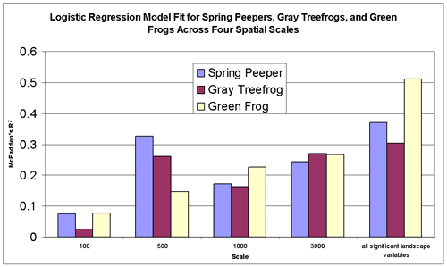 The bar graph shows the differences in logistic regression models used to indicate which scale is best at predicting the presence of 3 species of anurans (frogs) at different scales (distances in the landscape) and among landscape types. The graph shows the statistical fit of the logitic modelat different landscape scales (distances). |