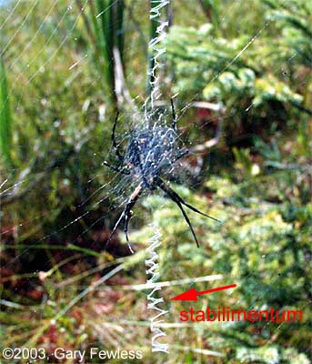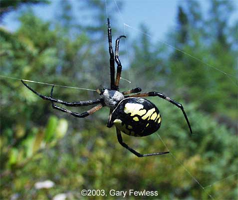 The largest orb-weaving spiders (family Araneidae) in Wisconsin are two species in the genus Argiope (pronounced ar-GUY-uh-pee), A. trifasciata and A. aurantia (shown here in ventral view). Females of the two species are easy to separate by looking at the top of their abdomens. A. aurantia displays an elaborate pattern of yellow spots on black, and A. trifasciata’s abdomen is crossed with numerous black, silver, and yellow stripes. Both species are daytime predators that usually hang head down in the center of their webs, which they often spin in fields between tall grasses or forbs. Their web is distinctive not only for its great size—dragonflies are often snared by them—but because of the zigzag silk banding, called the stabilimentum, that the spider decorates the center of the web with. Scientists argue about the function of the stabilimentum (some evidence indicates it attracts insects), but this gives the spiders one of their common names, “writing spiders”. These species are the basis of the popular children’s story about a literate spider, Charlotte’s Web. It was once held in the southern United States that seeing one’s name written by the spider presaged one’s death. In any case, the writing spider’s web does indeed spell death for many flying and jumping insects of Wisconsin’s fields, such as the flower fly (family Syrphidae) wrapped up in the upper left corner of this photo (note the large red eyes). Just before dying in the autumn, the females will produce a single brown leathery egg sac, filling it with hundreds of eggs. The spiderlings hatch, then spend the winter inside the sac. They emerge in the spring and make small webs near the ground. As they grow through the summer, the webs get larger and higher, and the web/spider combination becomes conspicuous in August and September, before the first hard freeze kills most of those who remain. The males are rarely seen except in the vicinity of the female’s web; they are about 100 times smaller than the females.