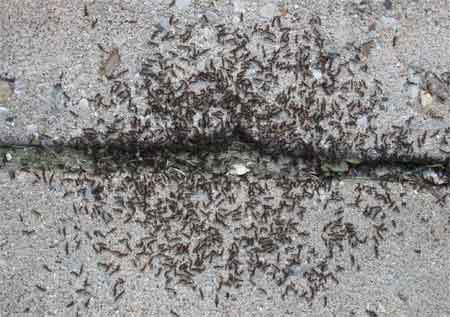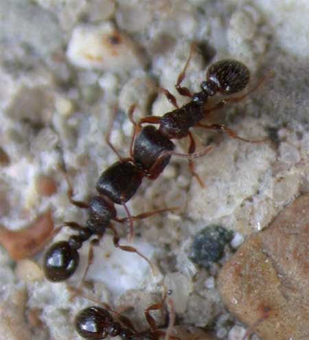 I was surprised when I walked down my driveway and found this dark patch of fuzzy litle worm-like creatures. At first I thought I was observing newly hatched caterpillars, but as I looked closer I realized each little caterpillar was actually two ants grapelling head to head. It was an ant war! These ants were pavement ants (Tetramorium caespitum) . They often build nests under rocks and pavement so they are a common ant to find in your driveway. These ants, although they live all over the eastern United States, are an exotic species introduced from Europe. They feed on a number of different things including aphid honeydew, seeds, and live and dead insects. Usually we think of ants as ferociously protecting their nests from other species, but in this case two different colonies of the same species are fighting. Ant wars like this one usually result from territory battles. Each ant colony protects an area around the colony that it uses for food foraging. Ants use patrolling workers that release unique colony pheremones to mark their territory. As the population of workers in the colony grows more food than the original area can supply is sometimes needed. If the ants enter an area defended by a different colony battles result. When two ants from different colonies meet, they will face each other in a posture intended to frighten the other away. They release pheremones that other ants in their colony will recognize and move toward and often a line of ants facing each other forms. If neither ant backs down the the ants fight each other by locking jaws and pushing forward or by flipping their opponents and stinging them. In territorial battles, usually one colony will back down before a majority of worker ants are killed. Ants are social insects where a large number of sterile workers protect one reproductive queen. In small colonies there are few if any specialized "soldier ants" that often occur in larger more complex ant societies so each worker must do a variety of tasks and so is very important to the colony's survival. If too many ants die, there will not be enough food collected and the colony will die. Because of this, ant wars in small colonies like this rarely result in the complete destruction of a colony. More info on Pavement ants Here is a link to an ant war experiment by Paul Johnson at the University of New Hampshire that you can try at home or at school! Contributed by Vicki Medland of the Cofrin Center for Biodiversity |