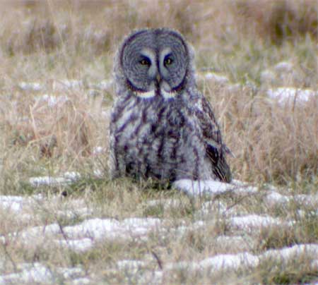 Great Gray Owls (Strix nebulosa) are the largest owls in North America (24-33 inches tall). They are, as their name suggests, gray in coloration, with brown mottling on the body and a white throat patch. These northern owls have large round-heads, with a black-edged facial disk, yellow eyes and a yellow bill. The tail is long and extends beyond the folded wings. Great Gray Owls prefer to hunt in the open and often feed during the day, so they are easier to find than some of our night-feeding owls. Although Great Gray Owls are usually only seen in boreal forests of the far north, from the northern US Border to Hudson Bay, your chances of seeing them this winter have greatly increased. Many owls have been seen at Wisconsin Point near Duluth, MN and Superior, WI. People are seeing as many as 20 owls in an afternoon. In fact sightings of Great Grays are up all along the northern border of the US from Michigan throughout the Northwest. Over 1300 owls were observed in Minnesota on a recent count. Great Grays are reluctant to fly over water so they are less likely to move into WI across Lake Superior, so WI will see fewer birds. Some bird experts believe they may be found in WI as far south as Horicon. Expect to see them until February, when they will return north to nest. A few birds appear to nest regularly in northern Wisconsin, while larger numbers occur in northwestern Minnesota. Great Gray "invasions" into southern Canada and sometimes into northern United States occur on about a 4 year cycle in response to changing prey abundances (Cheveau et al. 2004). The owls' preferred prey are voles (up to 80% of their diet according to a recent BLM report) as well as other rodents. Voles are subject to large fluctuations in population size that rise and crash in response to changes in vegetation and predator densities. A current hypothesis suggests that specialist predators like Great Gray Owls are responsible for fluctuations in vole populations (Hudson and Bjornstard, 2003). When vole populations decline the birds roam farther south in search of food, often into the Great Lakes States. This year birds are roaming farther south than before. In an article in the Milwaukee Journal, birding experts remind people wanting to see owls to stay in their car and shut off the engine and to get no closer than 75 feet. Too much attention and noise is stressful for these birds and interrupts their hunting behavior.