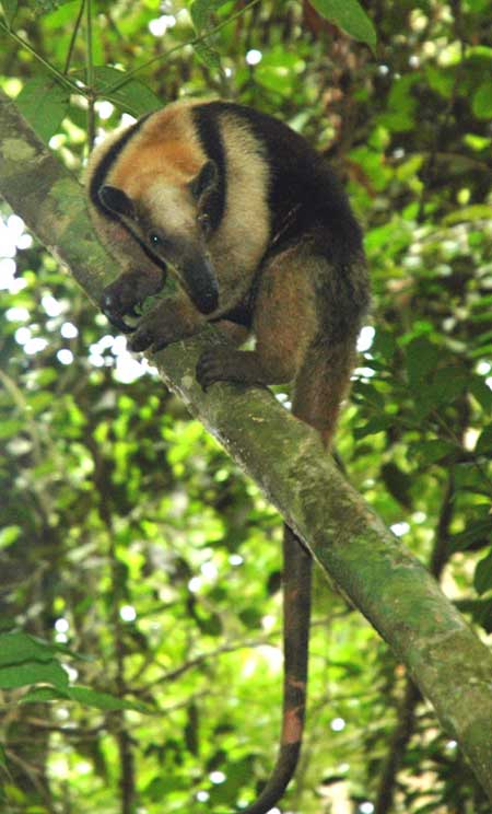 The Southern Tamandua (Tamandua tetradactyla) is a species of ant eater found in Central and South America. As demonstrated in the photo, Tamanduas spend most of their time in trees, using their long tails and claws to climbing. They also use their tails as a stand to hold themselves upright. They are solitary and active both during the day and the night. Like other anteaters they uyse their claws to break open ant and termite nests and catch the insects on their long sticky tongues. They are not timid and will protect themselves by slashing with their claws. They will even brave the attacks of bees and will break open nests and feed on the grubs and honey.