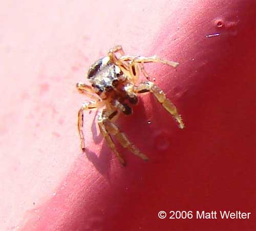 The most diverse family of spiders worldwide, with over 5,000 described species, is the Salticidae, or jumping spiders. Few jumping spiders (none in Wisconsin) make webs to capture prey. Instead they use stealth and agility to leap upon and subdue their insect food. Like all spiders, they do make silk, though. They use their silk to wrap up their eggs into an egg sac, to make little "sleeping bags" to pass the night, and they trail a dragline behind them when they jump, so that if they miss they don't fall all the way to the ground. Jumping spiders are diurnal visual predators, they use their excellent eyesight to capture their prey. Their huge front middle eyes allow them to make out good images from several inches away, and their smaller rear eyes are used to detect the motion of potential prey. You can always tell if a jumping spider is looking at you (or your waggling finger) because they don't have necks, they have to turn their whole body to face the object they wish to view. Like many jumping spiders, Habronattus species use their vision to select and court mates as well as to capture prey. The males (like the one here) have evolved elaborate coloration and ornamentation. Males rely on visual courtship displays ("mating dances") to entice females to mate with them. The females lack the bright colors and ornamentation and often are cryptically colored and blend in with their habitats. There are many species of Habronattus, and they all have slightly different coloration and mating dances. |
