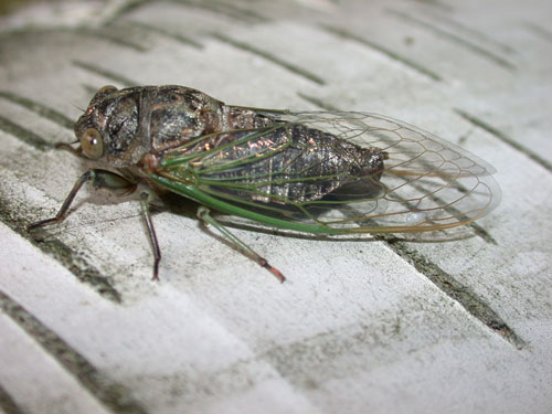 Annual Cicadas The cicadas you hear in the late summer are all annual cicadas and are easily differentiated from the periodical cicadas that emerge in large numbers in the spring by their loud rising buzz. In Northeastern Wisconsin the cicada most often heard in the afternoon is . These, and about 7 of the 9+ species found in Wisconsin are commonly called annual cicadas because even though they have 2-4 year lifecycles, adults emerge every year because the broods are not synchronized. Cicadas songs sound similar to those of katydids and crickets (family Orthoptera), however, cicadas are in the family Homoptera and are closely related to aphids and leafhoppers. Only male cicadas produce their amazing song and they do it through a mechanism found in no other insect. Crickets, katydids, and grasshoppers rub their wings or legs against their bodies in a process called stridulation. Cicadas are able to create a much louder sound through a pair of abdominal organs called tymbals. Each tymbal is a ribbed membrane located just below the wing base that can be deformed by a pair of powerful of superfast abdominal muscles. The loud buzz we hear occur as each the ribs of the tymbal are pulled into the abdominal cavity it produces a resonant pulse of sound. The exact mechanism is complex and scientists are still trying to reduce the buzz to its individual components, but it amounts to an incredibly loud superfast clicker. This method is so effective that some large Australian cicadas can produce noise at levels close to the human pain threshold of 120 db and are the loudest insects in the world. Sanborn and Phillips (1995) found that loudness (sound pressure) in cicada calls is directly related with insect body mass. The loudest cicadas are also the largest. Tibicen walkeri, a cicada found in the southeastern United States, is the current US record holder at 108 dB. However, larger cicadas exist in Southeast Asia that have not yet been tested and are most certainly the loudest in the world. Scientists disagree about why the song is so loud. It certainly allows males to call in females from a long distance away. Cicadas also use the tymbal to produce an alarm call and some scientists believe that the loud sound scares away potential predators like birds. Scientists at the University of Connecticut studying cicada mating behavior have shown that females choose males based on the quality of their songs and males change their songs in response to female behavior. They have also shown that males can change their call to distract females responding to the calls of nearby males. Cicada Resources |