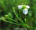 Water plantain is an early colonist of muddy soils, pond edges and roadside ditches. The inflorescence branches repeatedly to produce numerous small white, 3-petaled flowers. Each flower matures into a head of achenes as shown above. Plants previously referred to as Alisma plantago-aquatica L. are now divided into two species (A. triviale Pursh.and A. subcordatum Raf.), distinguished primarily by size of flowers and achenes as follows: