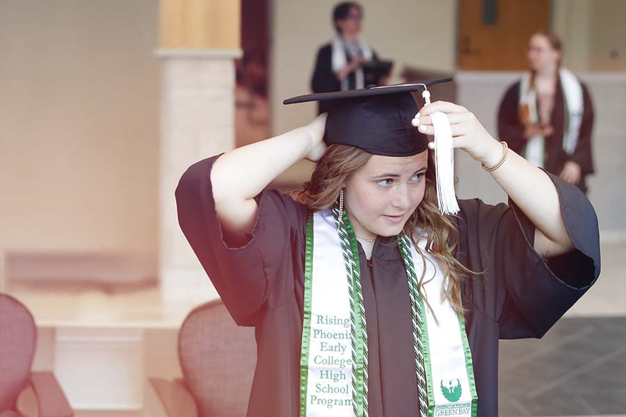 The Rising Phoenix Early College High School Program is a transformative partnership between participating rural school districts and UW-Green Bay—redefining what’s possible for high school students. Through dual enrollment, personalized student success coaching and a rigorous academic pathway, students can earn both a high school diploma and an Associate of Arts and Sciences degree—all by the end of their senior year.